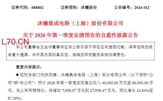 3月4日晚间,沐曦股份(688802)发布一季度业绩预告。公司预计2026年第一季度实现营业收入4亿元至6亿元,与上年同期相比,将增加7958.47万元到27958.47万元,同比增长24.84%至87.26%。
