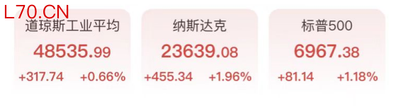受美国与伊朗有望重启和平谈判的乐观情绪影响,美国主要股指上涨,同时投资者对最新一批银行财报与美国通胀数据进行了评估,纳指连续十个交易日收高,标普500指数逼近7000点。截至收盘,道琼斯工业平均指数上涨317.74点,涨幅0.66%,收于48535.99 点,纳斯达克综合指数上涨1.96%,收于23639.08 点,标普500指数上涨1.18%,收于6967.38点。