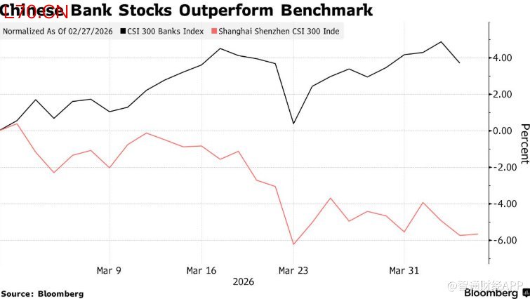 花旗集团分析师表示,银行第一季度业绩有望超出预期。他们指出,银行管理层已经表示,随着息差压力缓解和手续费收入强劲增长,其营收增长前景将更加乐观。自中东冲突爆发以来,沪深300银行指数已上涨2.7%,而同期沪深300指数则下跌了5.7%。