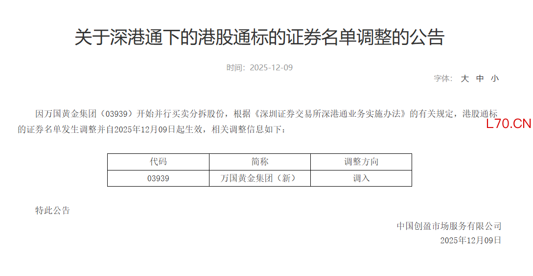 深交所:万国黄金集团调入港股通标的证券名单