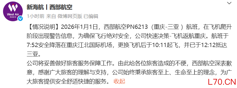 西部航空通报一客机紧急返航:飞机爬升阶段出现警告信息