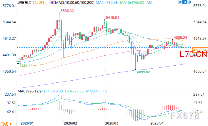 现货黄金日线图 来源:易汇通北京时间4月24日10:47 现货黄金 报 4680.54 美元/盎司