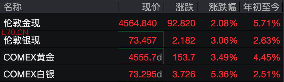 3月25日盘中,伦敦现货黄金价格一度站上4600美元/盎司。截至发稿,伦敦现货黄金价格报4564.84美元/盎司,日内涨幅2.08%;COMEX黄金价格报4555.7美元/盎司,日内涨幅3.49%。