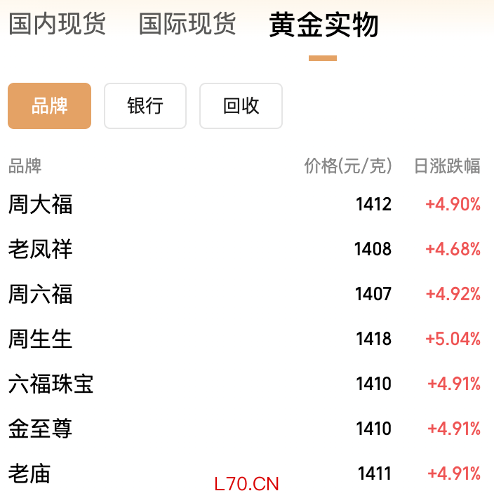受此影响,国内部分品牌金饰价格也随之上调,克价重回1400元。3月25日,周生生足金饰品报1418元/克,单日上涨68元;老凤祥报价1408/克,单日上涨63元/克。